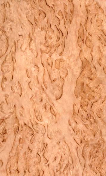 Description:The Korelian Birch Burl is cream-white to biscuit in color, with pitch flecks and a swirl figure. The burl is rotary cut as a veneer; occasionally figured (fiddleback and curly); usually with many small, dark burl-like markings, creating a tear drop effec
